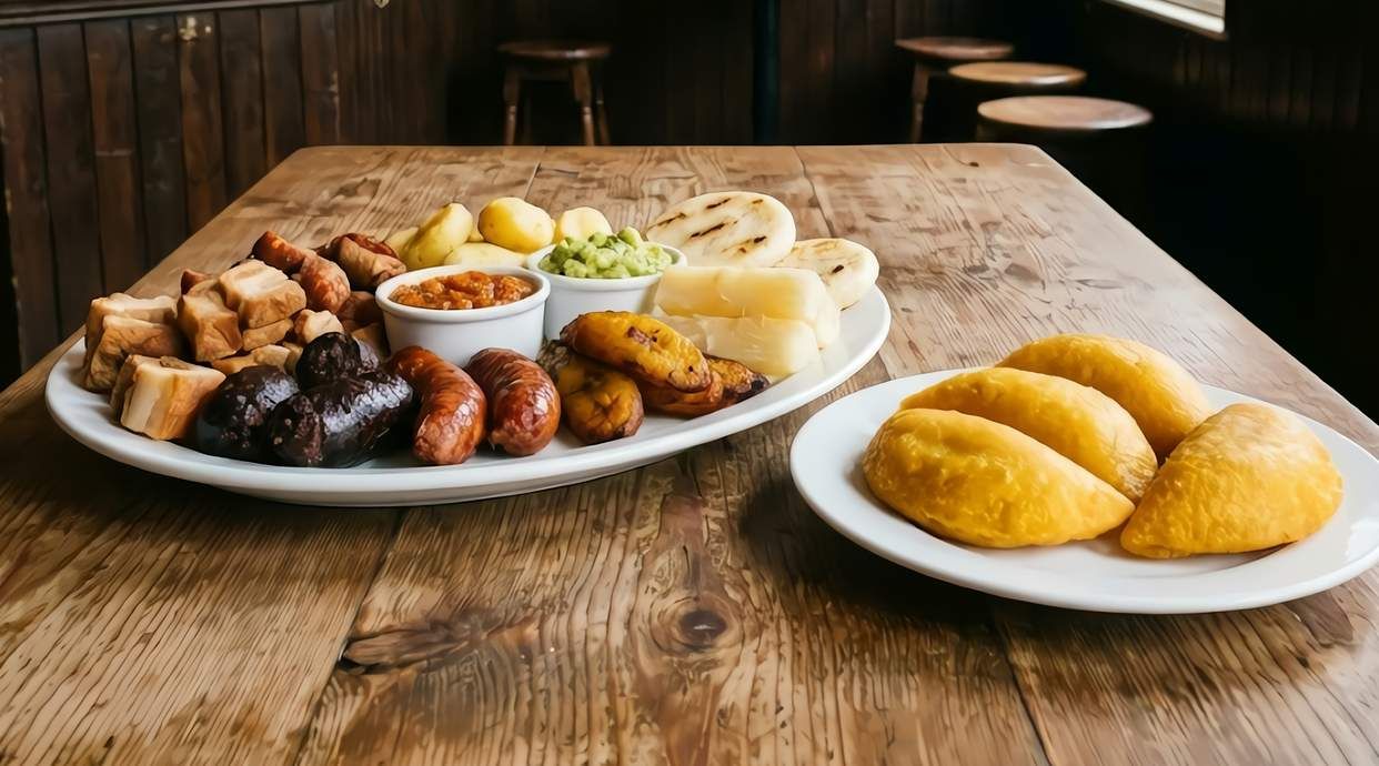 Una generosa selección de los sabores más auténticos de Colombia, ideal para compartir. Este plato incluye: 3 arepas mini rellenas, 3 patacones con carne, guacamole, y queso gratinado, 3 empanadas, 1 bolw de arroz y frijoles, plátano maduro macho, y 1 chicharrón crujiente