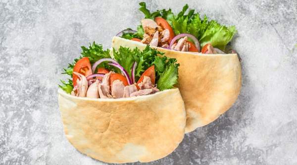 Carne de pollo, ternera o mixto, lechuga, col, tomate, cebolla, queso feta y salsas