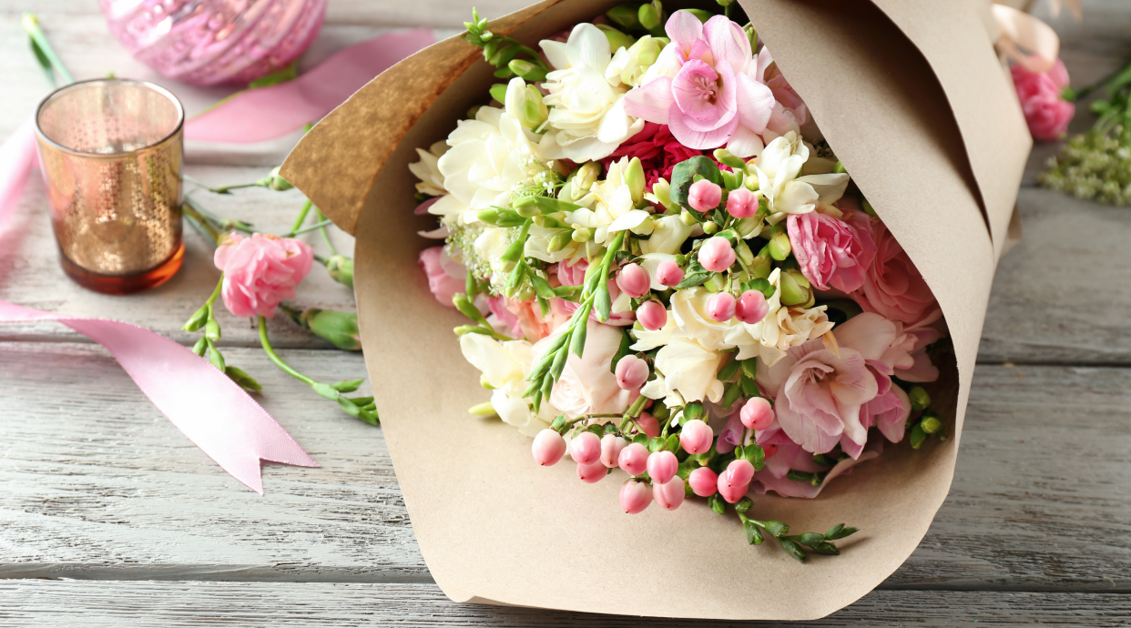 Cajitas Kraft con ramo de flores.