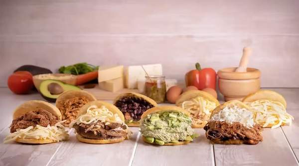 Puede elegir el sabor entre arepa con carne desmechada, pollo guisado, reina pepiada, pernil de cerdo horneado o pabellón
