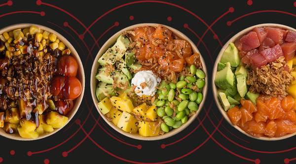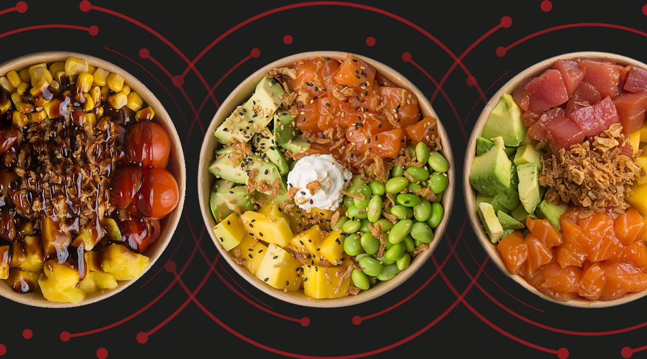 Poke bowl con base de arroz de sushi, salmón marinado a nuestro estilo, aguacate, mango, edamame, cebolla crujiente, mix de sésamo, queso philadelfia y salsa de soja.