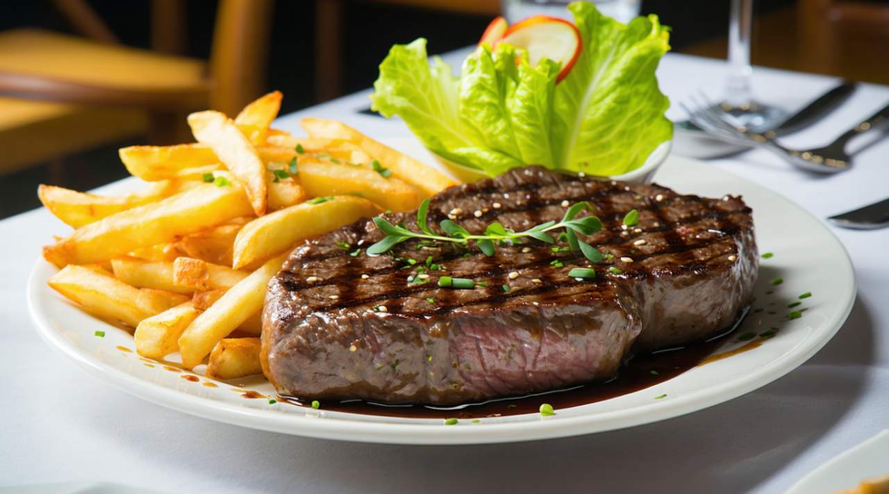 Tierno filete entrecot de calidad, servido con una guarnición de patatas y ensalada