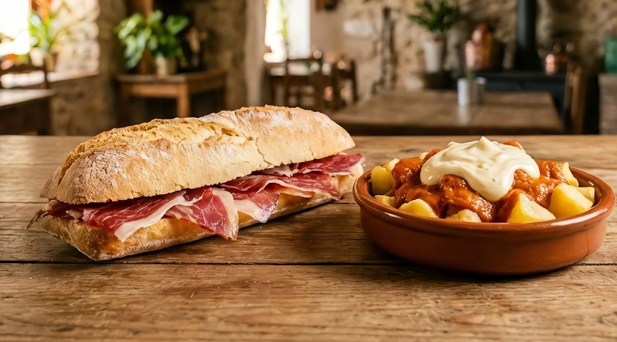 Bocadillo con jugosa paletilla ibérica en pan tierno, con base de tomate en rodajas, listo para disfrutar en cualquier momento. Ideal para pedir rápido, compartir o disfrutar de noche, lluvia o partido.