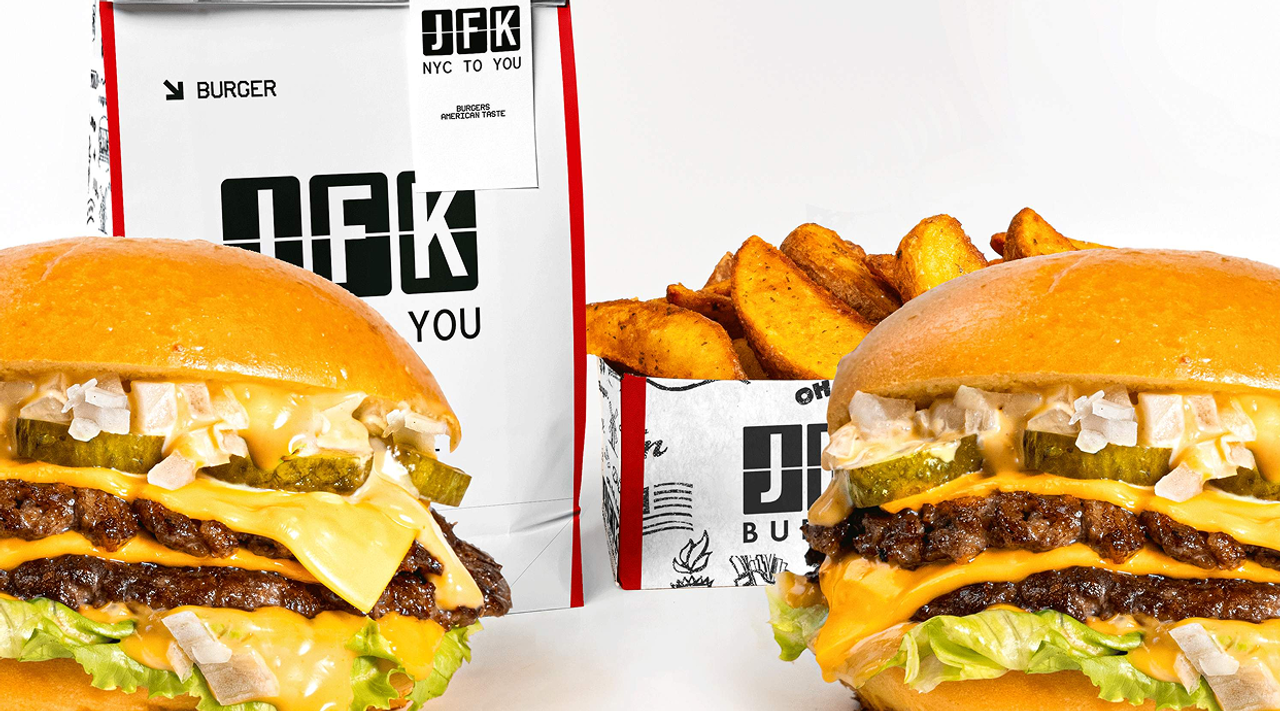 Pan brioche, salsa de la casa JFK, doble carne smash, doble queso cheddar, cebolla, lechuga iceberg y pepinillos