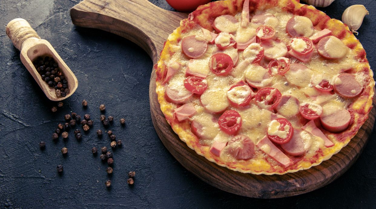 Salsa de tomate, jamón de pavo, salami de pavo, bacon de pavo ychorizo