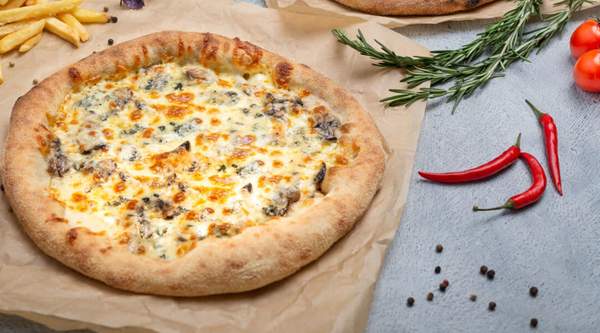 Salsa roquefort, queso, mozzarella, bacon, pollo y orégano