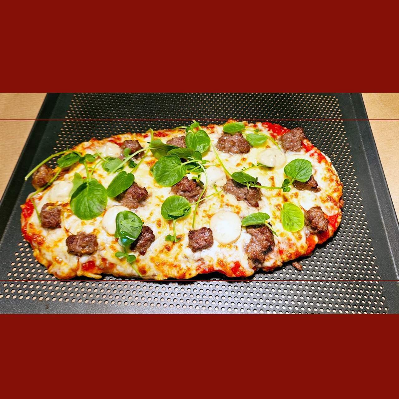La base es fundamental en "todo". Con eso resuelto: Tomate extra con oro líquido, mozzarella de la buena, nuestra carne Limusin, cebolla pochadisima, botones de salsa campo y hojitas de brotes de semillero.