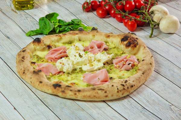 Pesto de pistacho, fior di latte, burrata, mortadela de Bolonia, parmigiano y pistachos Si la quieres igualita al local, precalienta el horno al máximo cuando hagas tu pedido y déjala durante 1 MINUTO !! ; )
