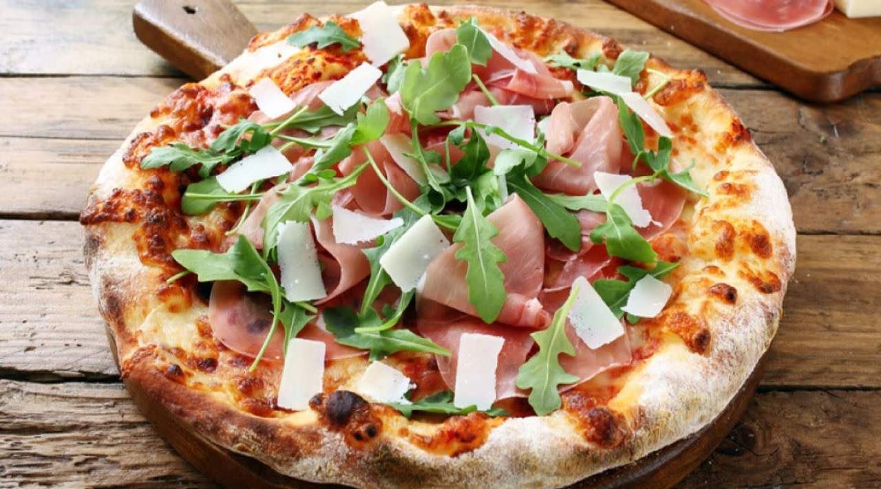 Tomate, mozzarella, salami, jamón, champiñones, pimiento, aceitunas, huevo y orégano