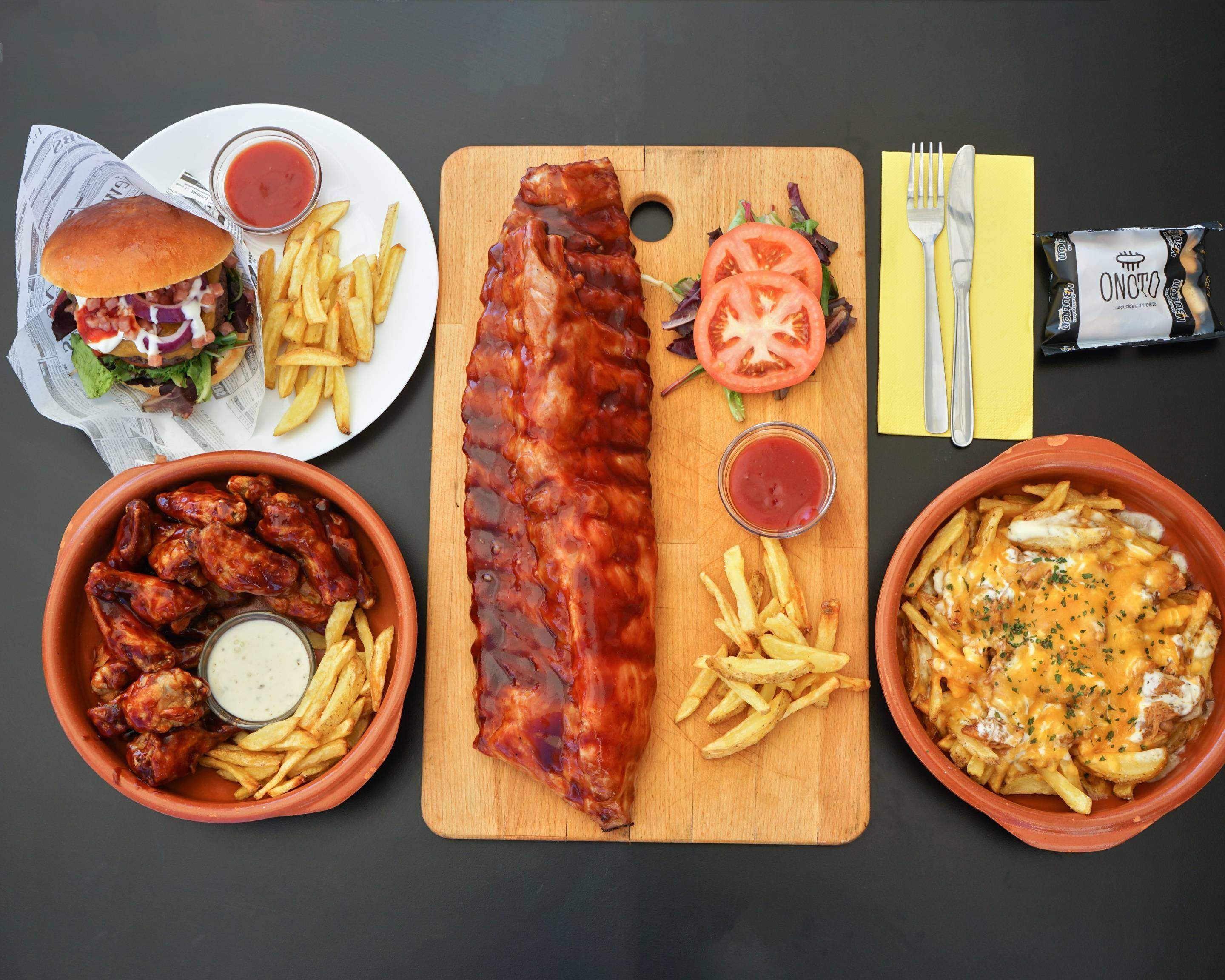 Costillar marinado y asado a baja temperatura en nuestra salsa BBQ acompañadas con patatas fritas.