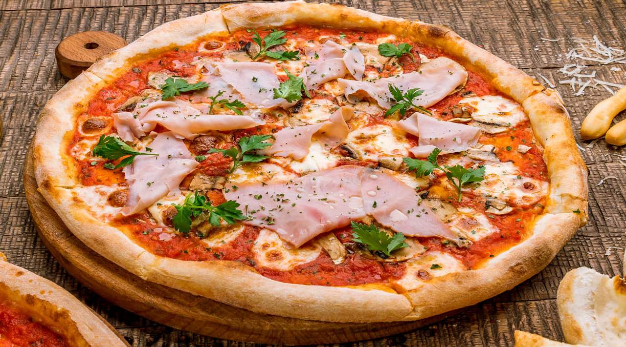 Tomate, mozzarella, jamón york, champiñones frescos, alcachofas y orégano