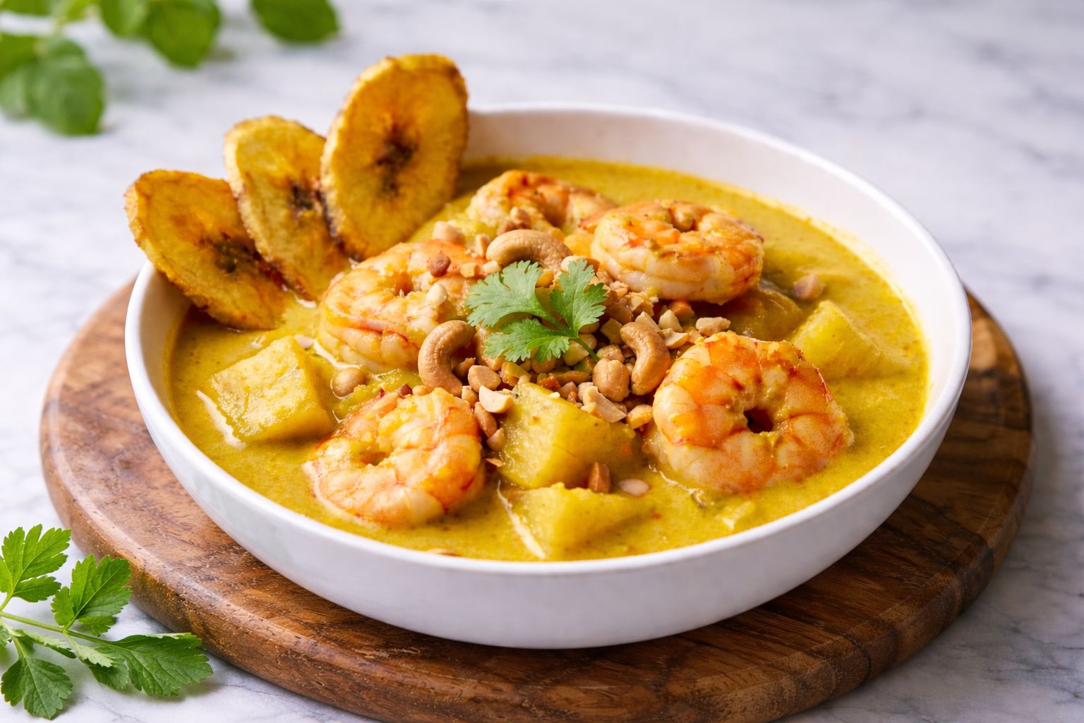 Tradicional guiso de camarones con yuca, leche de coco, cúrcuma, anacardos, cacahuete y chips de plátano.
