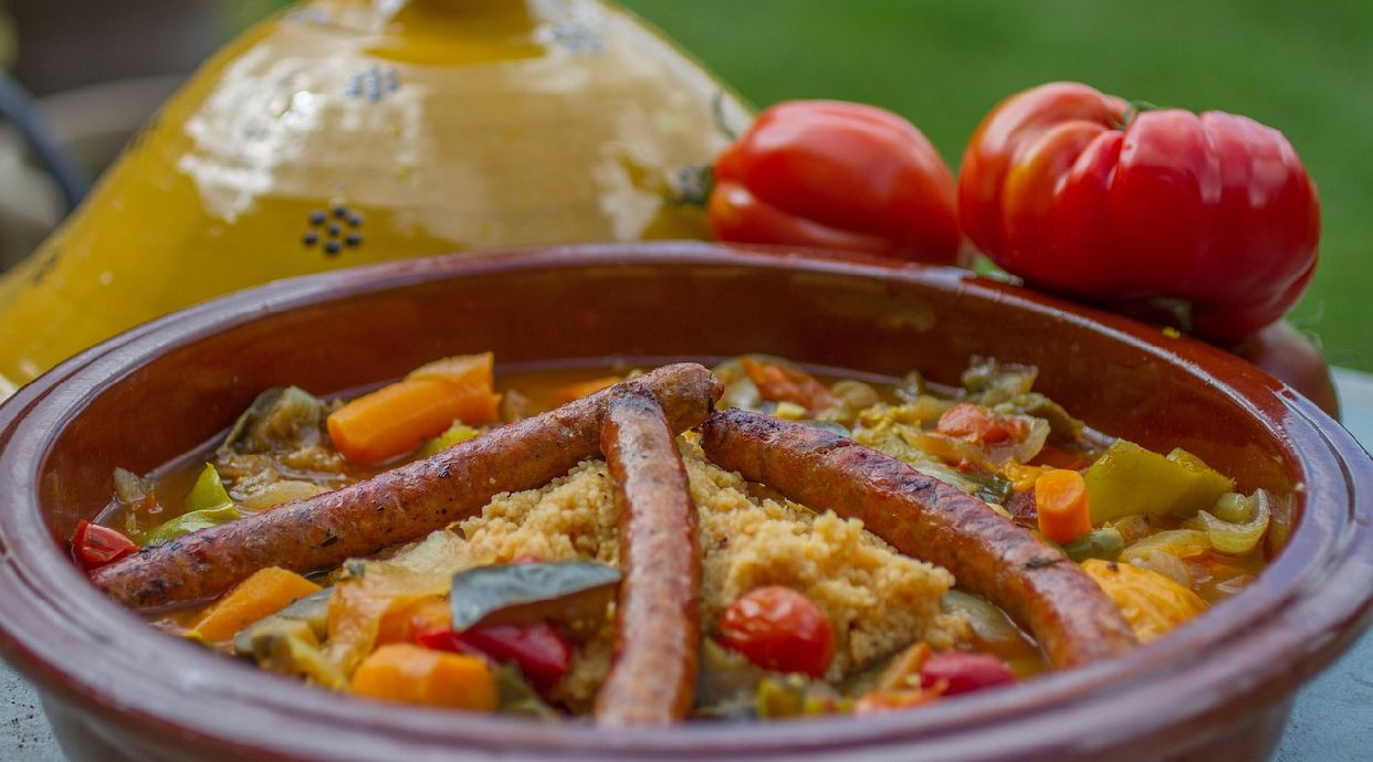 Plato tradicional de la cocina del magreb, que consiste en pequeñas bolitas de sémola de trigo con verduras como el calabacín, la zanahoria y la berenjena