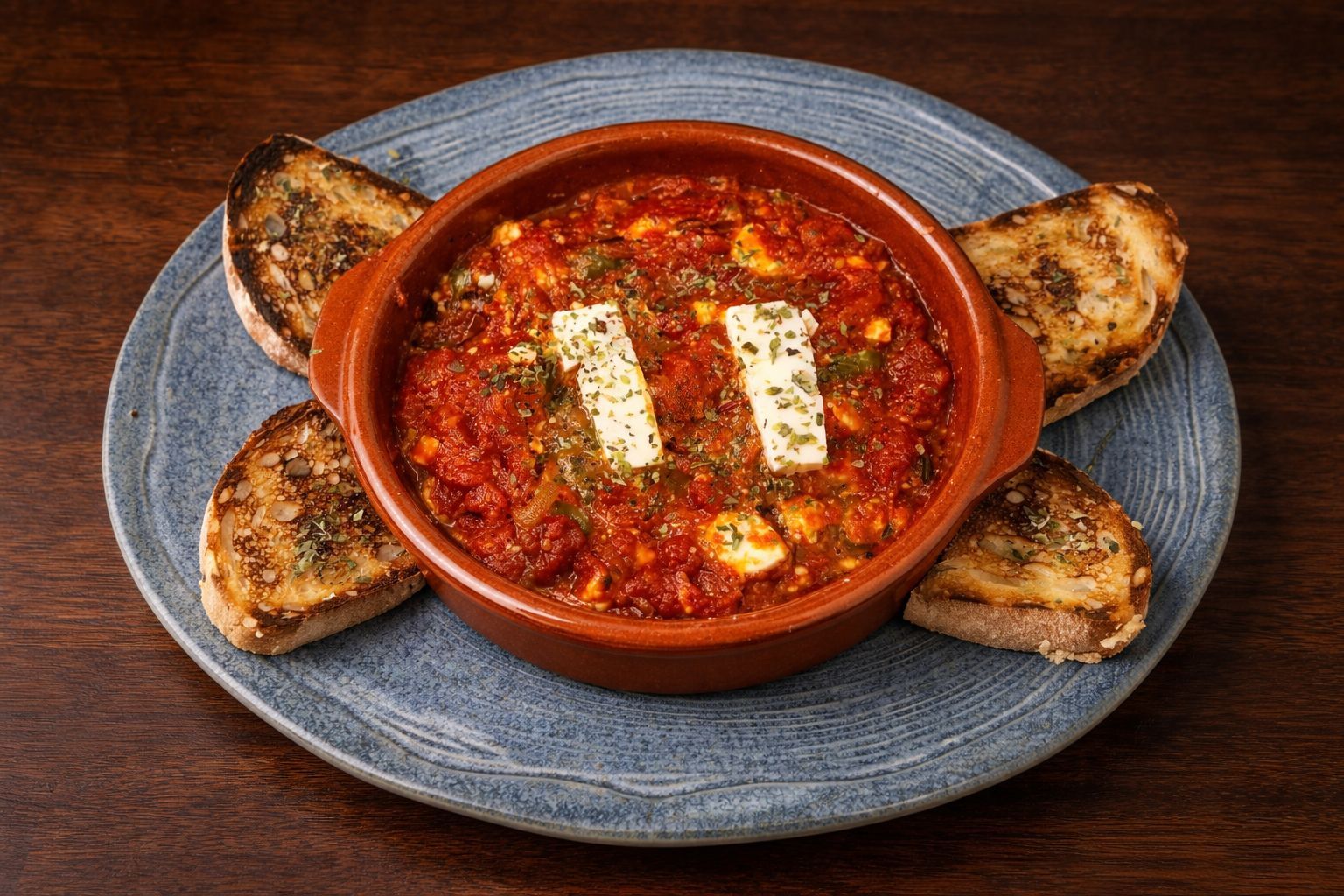 Salsa de tomate, gambas, feta, aceite de oliva, pimientos, orégano y cebolla