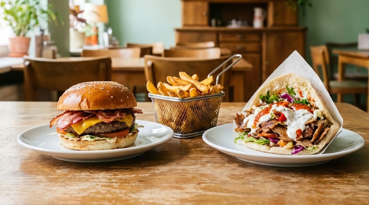 Carne de kebab de pollo, servida en plato con patatas fritas o ensalada fresca (lechuga, tomate y cebolla)