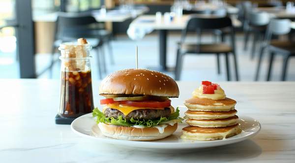 Bebida caliente de café o té, zumo de naranja exprimido, 2 huevos, tocino, salchicha, pancake de miel, mermelada