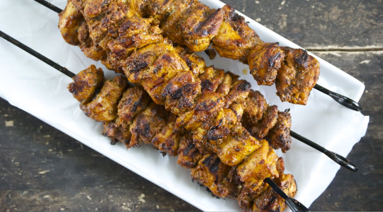 Brochetas marinadas de suculenta carne sazonadas con especias aromáticas, perfectas para asar o asar