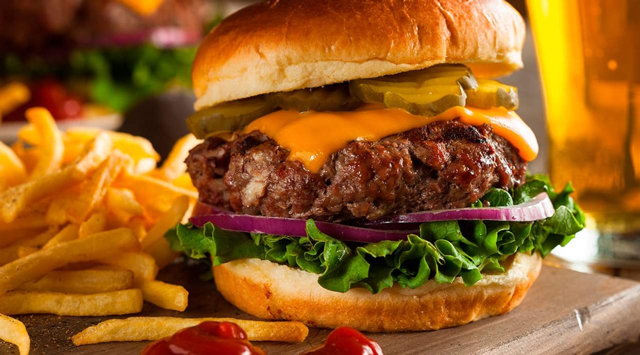 carne de ternera, bacón, huevo frito, queso cheddar, salsa burger, tomate, lechuga roble, cebolla natural y mostaza