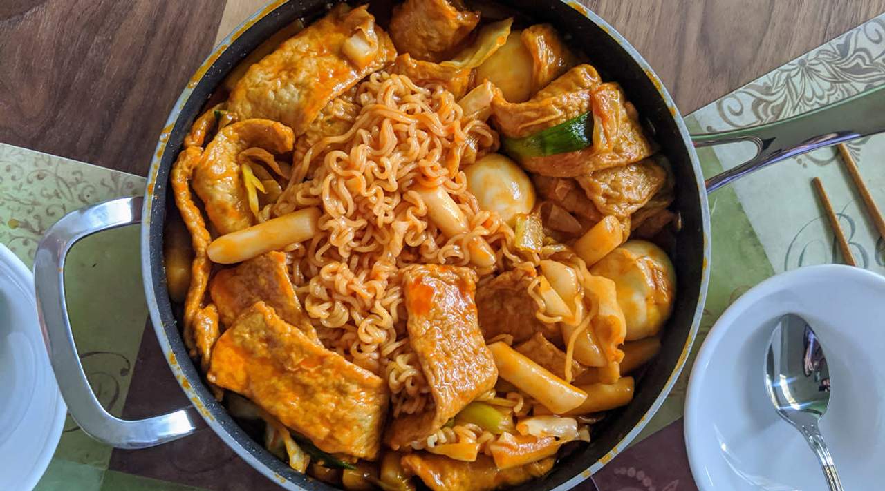 Pastel de arroz, fideos (ramyun) y huevo con caldo picante y dulce HAY OPCION VEGANO, VEGETARIANO