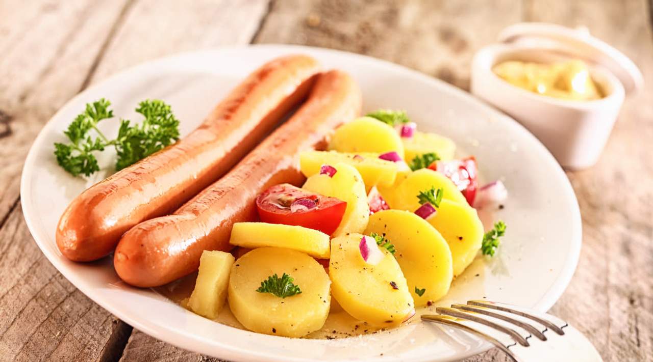 Auténtica salchicha alemana acompañada de arroz y patatas