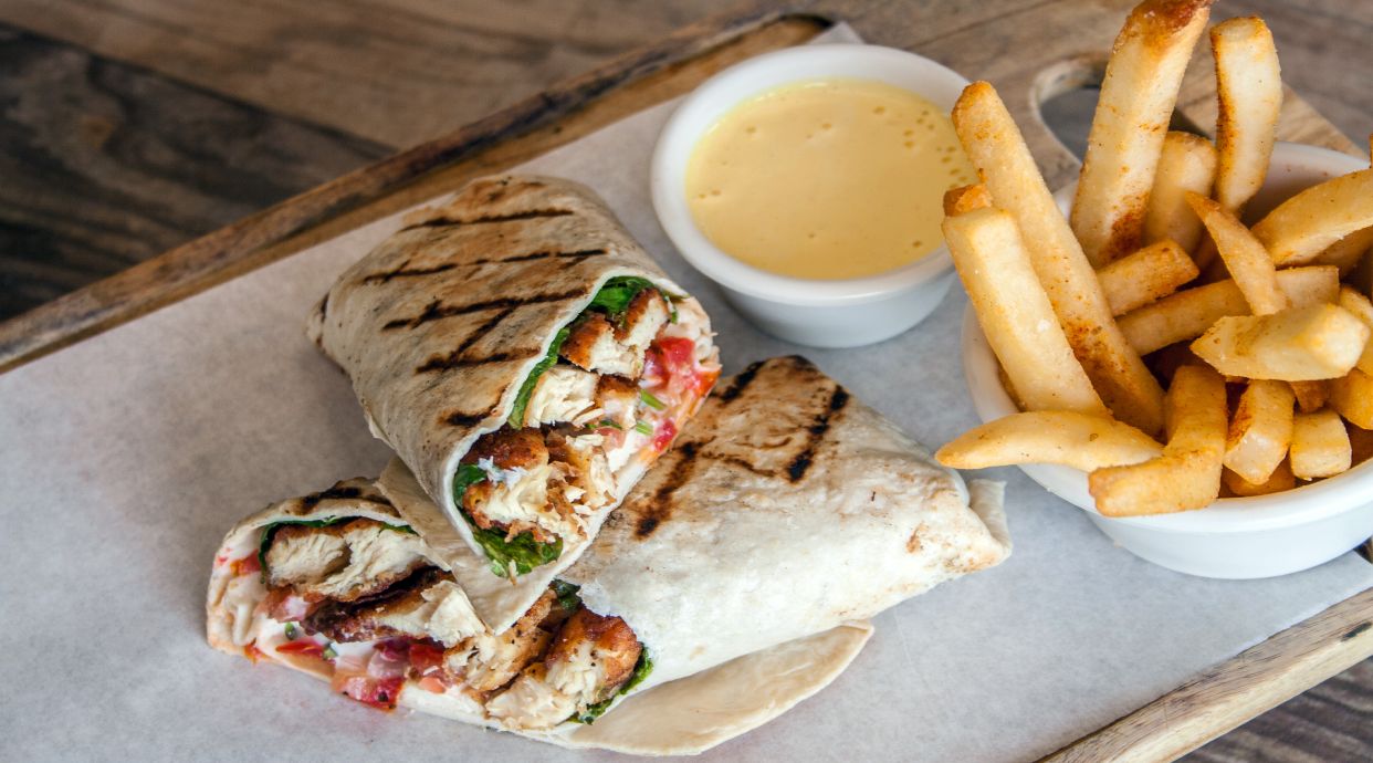 Carne de ternera o pollo asada con queso, servida en pan pita con lechuga, tomate, cebolla y salsa
