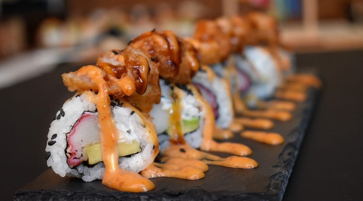 Roll de pez mantequilla, queso crema y aguacate con topping de pez mantequilla tempura, salsa carlina y salsa unagi