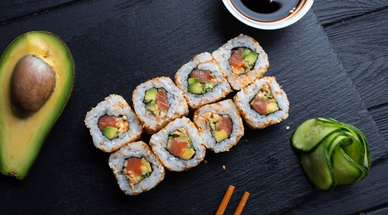 Base de arroz sushi blanco, cubierto de salmón, philadelphia, aguacate, mango, iceberg, sésamo y crema de aguacate