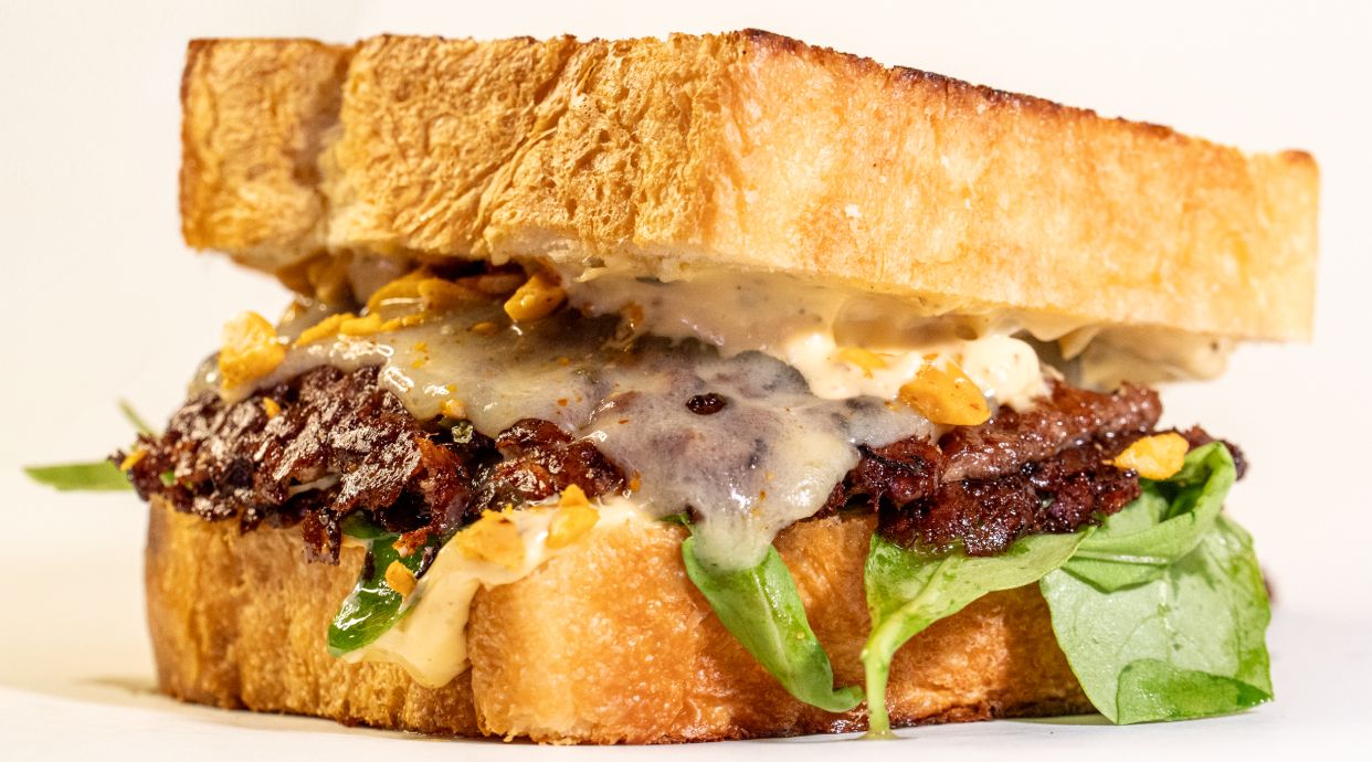 Pan brioche de molde, doble carne smash, queso Monterey Jack, mayonesa de albahaca y chilli dulce, rúcula y cacahuetes shichimi