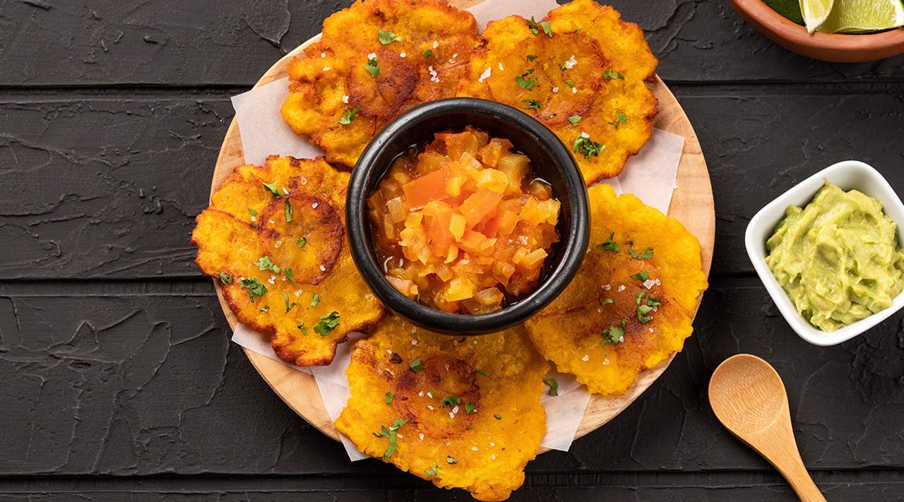 Tostón de plátano verde con sabroso pollo, suave y delicioso. Queso maíz y salsas