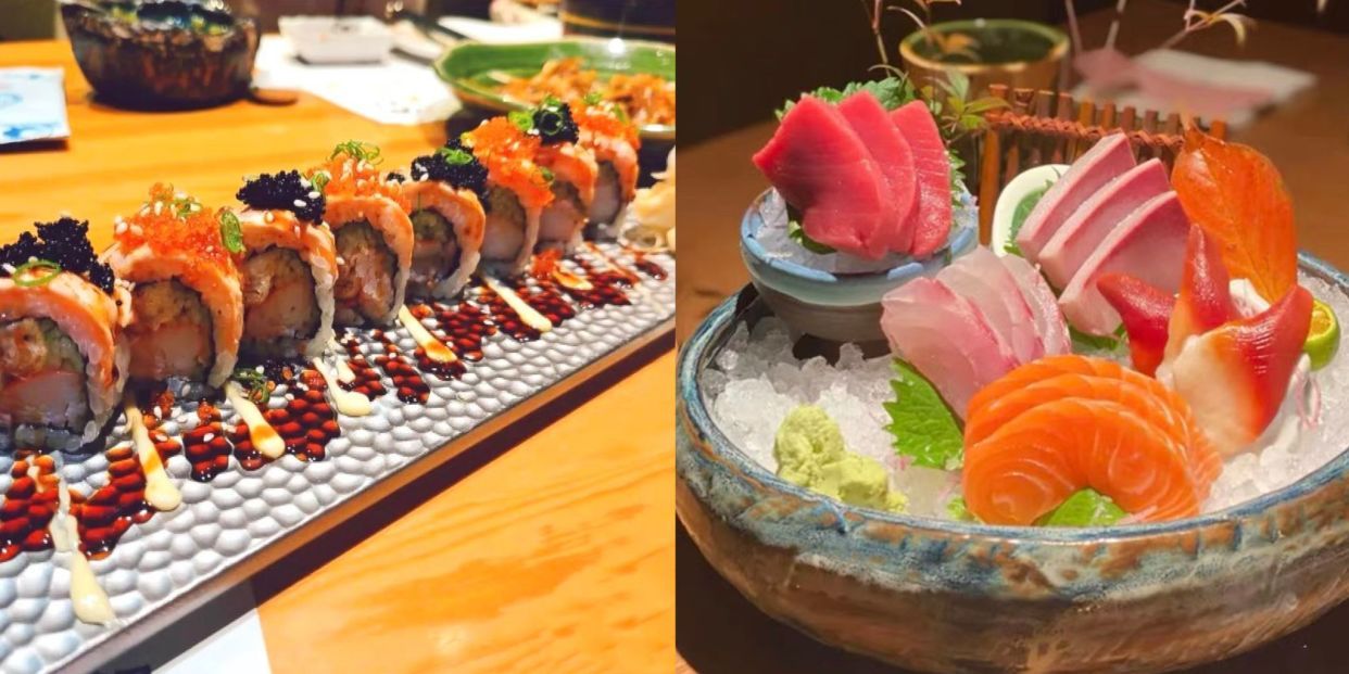 Nigiri salmón (6 pzs.), maki salmón aguacate (8 pzs.), maki aguacate (8 pzs.), crunch salmón roll (8 pzs.), sakai roll langostinos (8 pzs.), salmón roll (8 pzs.) y tasurami roll (8 pzs.)