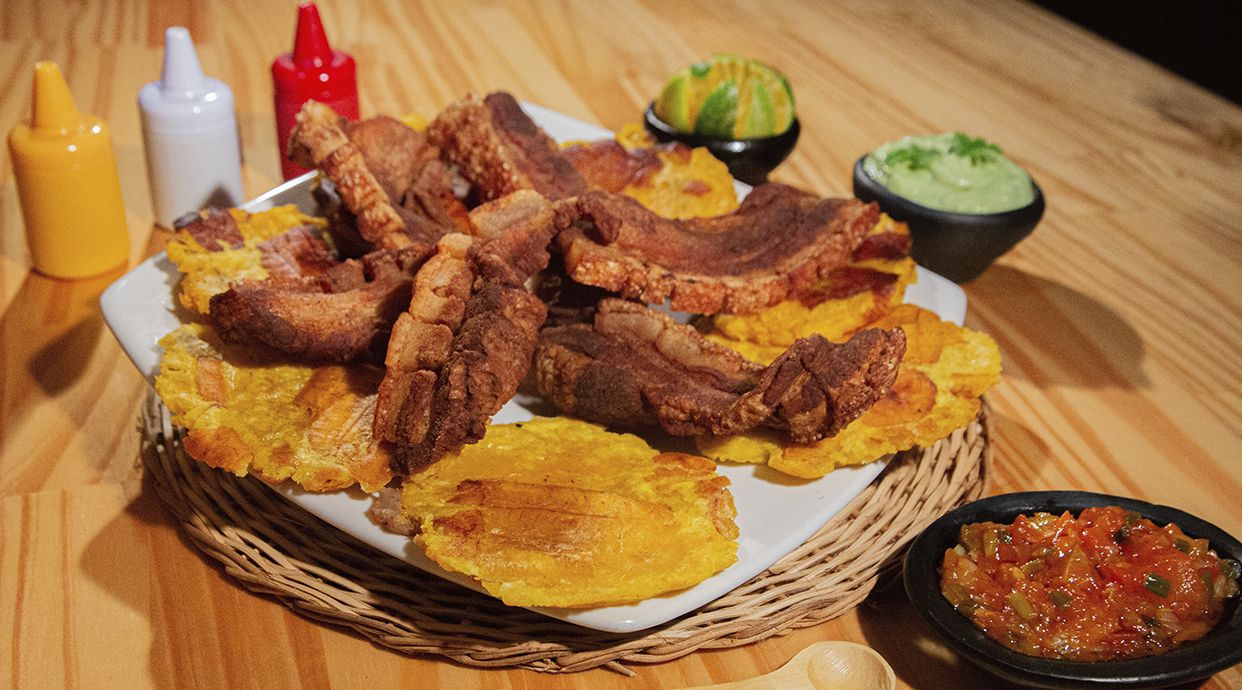 Plátano verde acompañado de cochinita, pulled pork y chicharrón