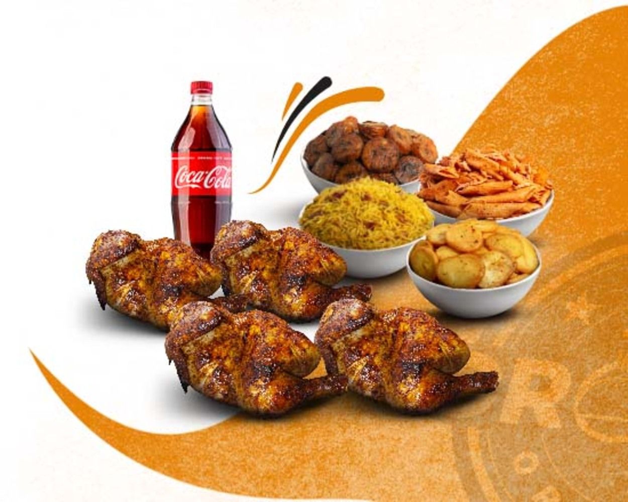 4 Medio pollos, 4 acompañantes y 1 bebida (1.5 lt.)