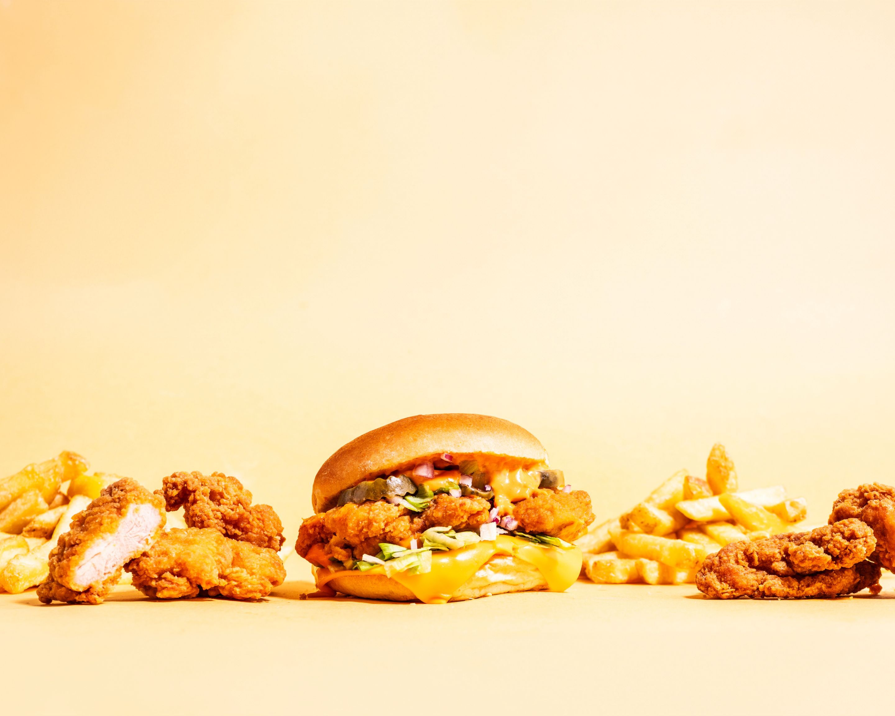 Una hamburguesa de pollo crujiente, una guarnición dorada y una salsa para mojar brutal