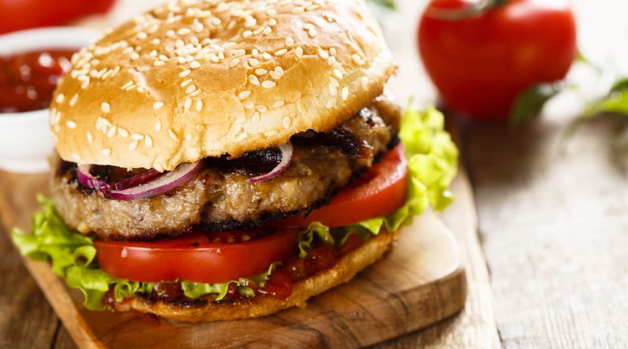Hamburguesa, queso, lechuga, tomate, kétchup y mayonesa.
