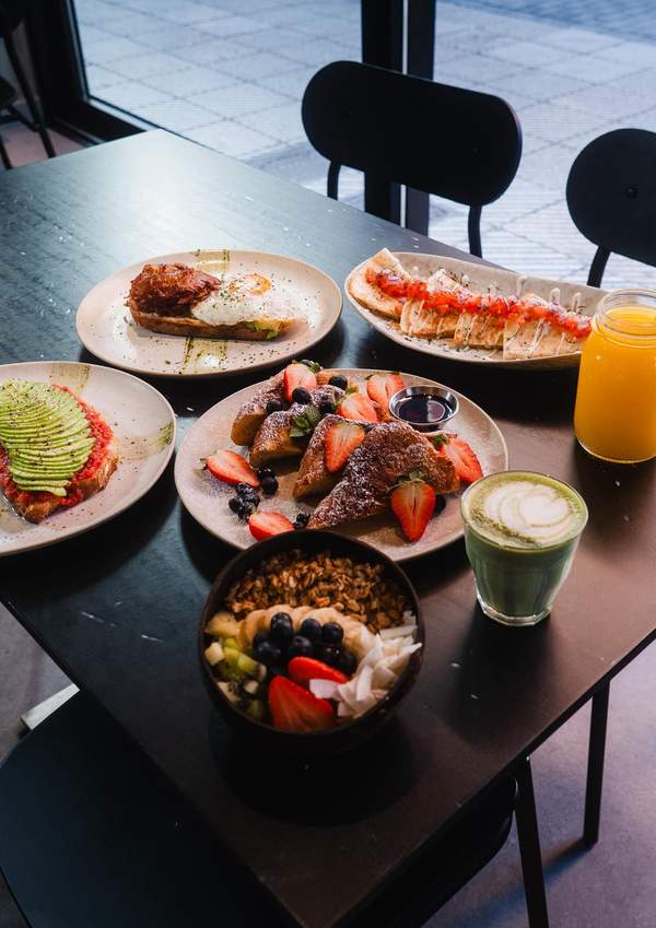 2 Bebidas calientes, 2 zumos de naranja, tostada de hummus, tostada con aceite y tomate y mantequilla y mermelada, bowl de Açai , gofre con frutos rojos y chocolate, wrap (pollo o falafel) y croissant