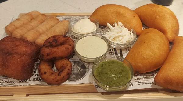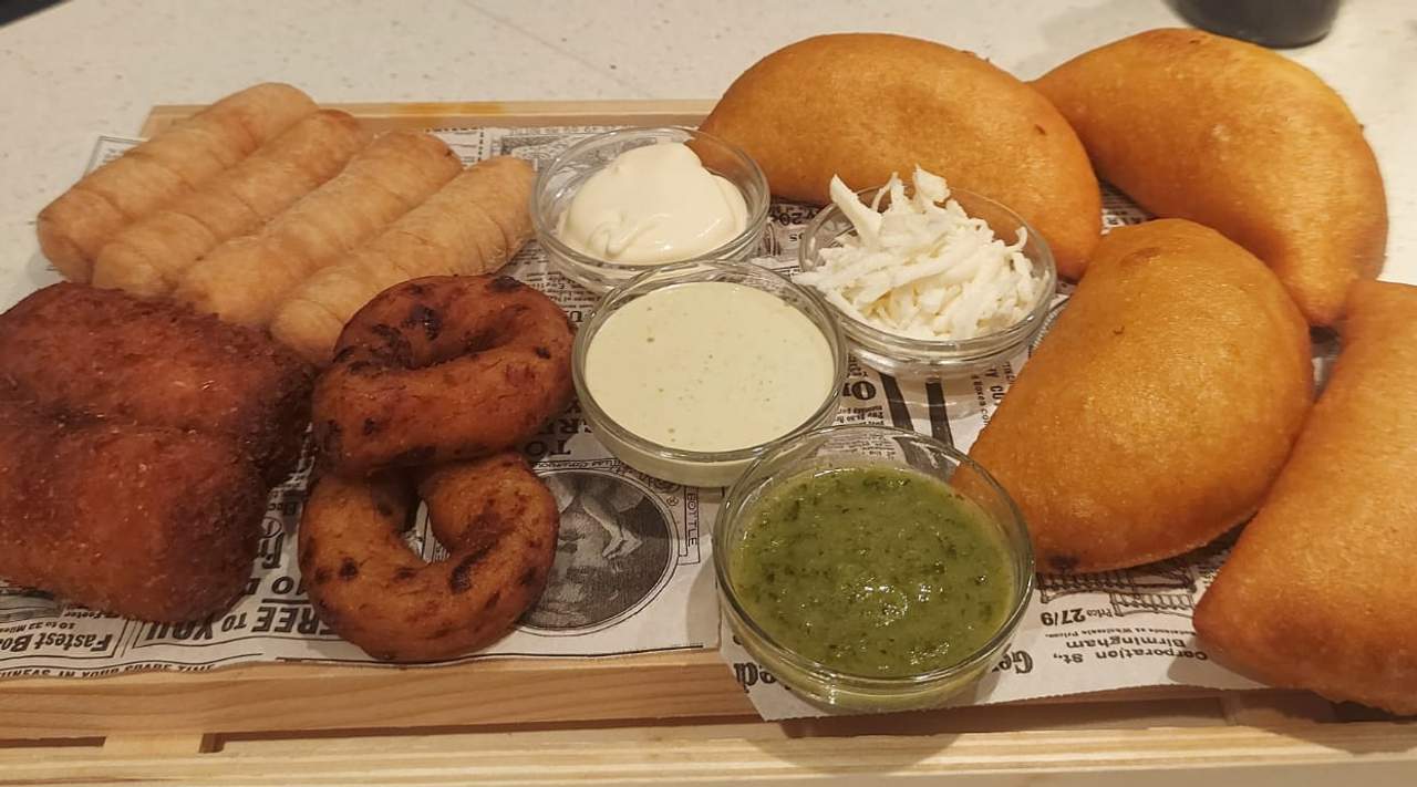 Tequeños tradicionales (2 uds.), arepas (2 uds.), empanadas (2 uds.), montaditos de patacón (2 uds.)
