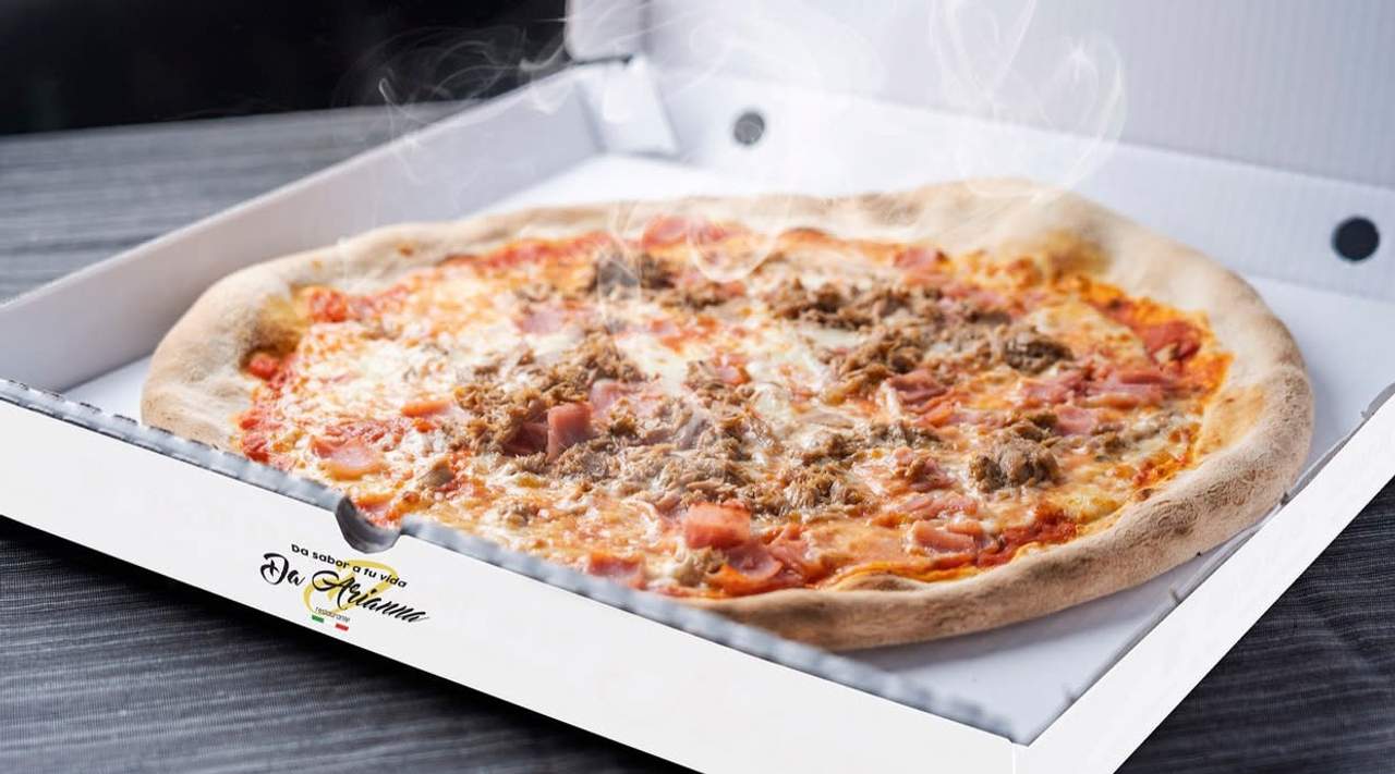 Tomate, mozzarella, atún, jamón, champiñones, gambas y aceitunas.