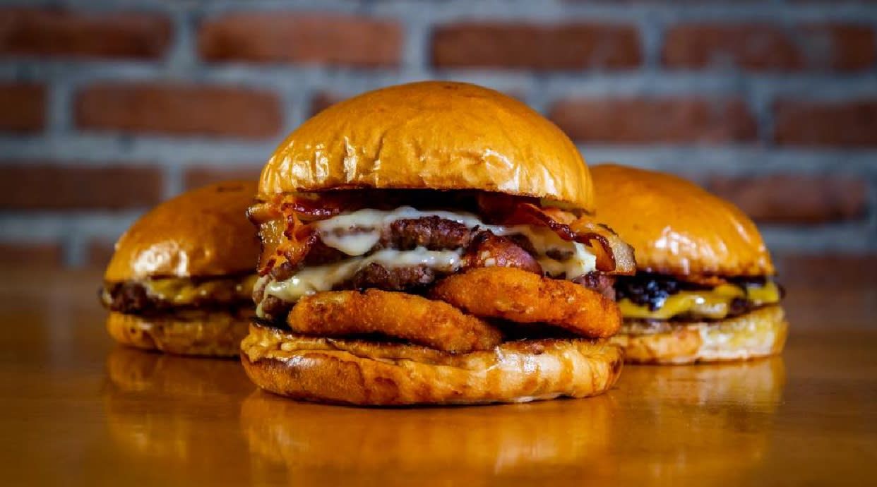 Hamburguesa doble con bacón, cheddar fundido, aros de cebolla, lechuga, tomate, ketchup y salsa casera