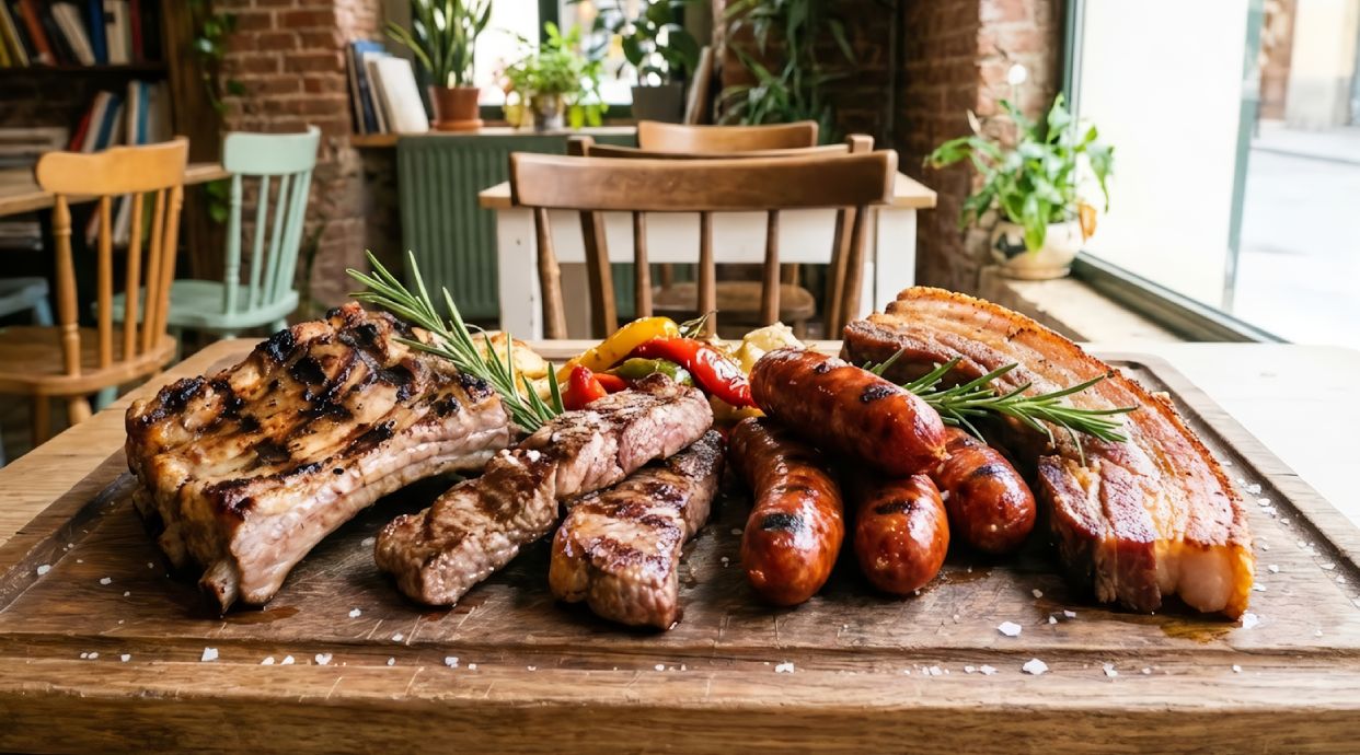 Panceta, chorizo, secreto ibérico, costillas ibéricas (con su guarnición)
