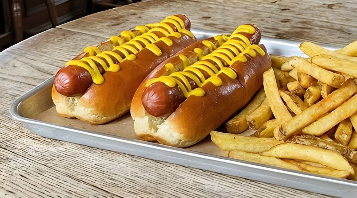 Salchicha frankfurt, kétchup, mostaza y cebolla frita