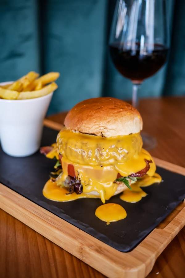 Hamburguesa de ternera con lechuga, tomate, cebolla crujiente, bacón, mayonesa ahumada, salsa cheddar y patatas fritas
