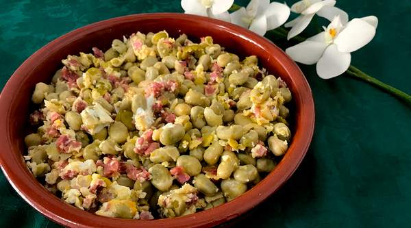 Finísimas habitas baby de navarra con taquitos de nuestro mejor jamón y huevos camperos.