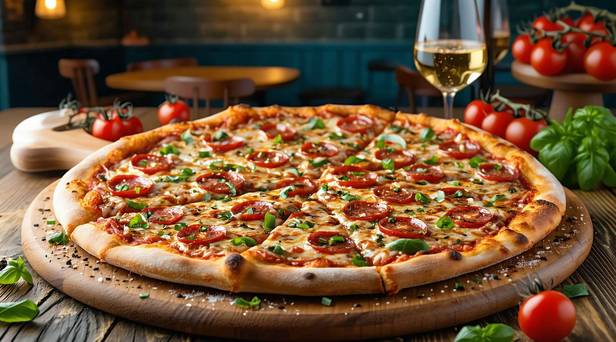 base de Tomate, mozzarella, verduras de la casa, pepperoni y gorgonzola y burrata