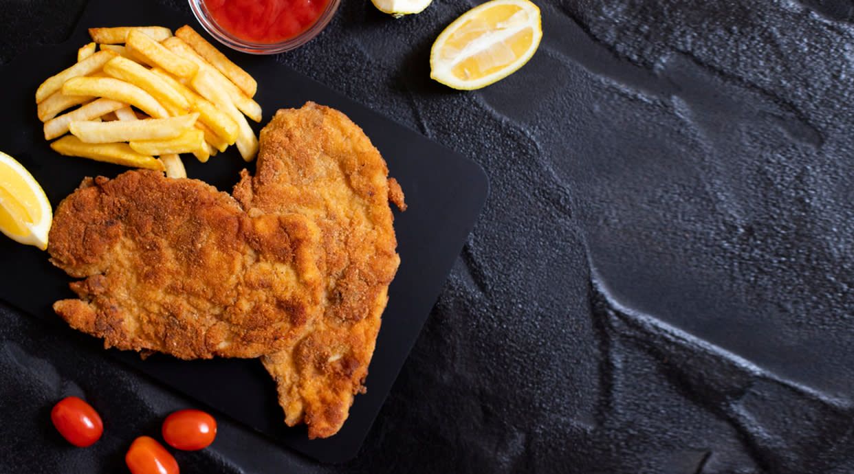 Para compartir, salsa de tomate, jamón, queso, papas fritas y huevo frito