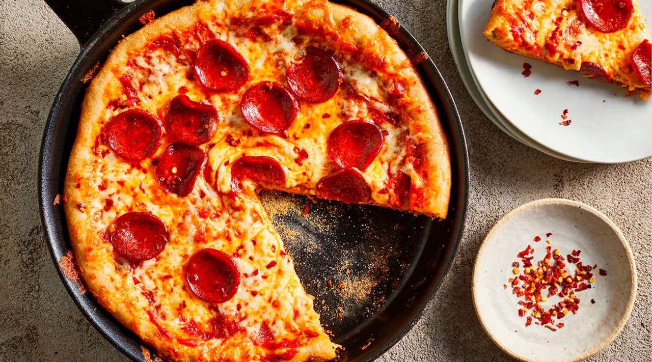 Salsa de tomate, queso, peperoni, cebolla y pimiento verde.
