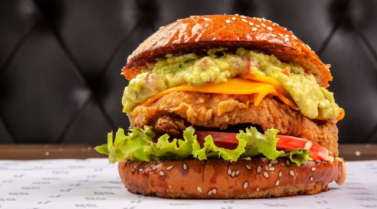 Pan, carne, cebolla, tomate, ensalada, col y salsa barbacoa