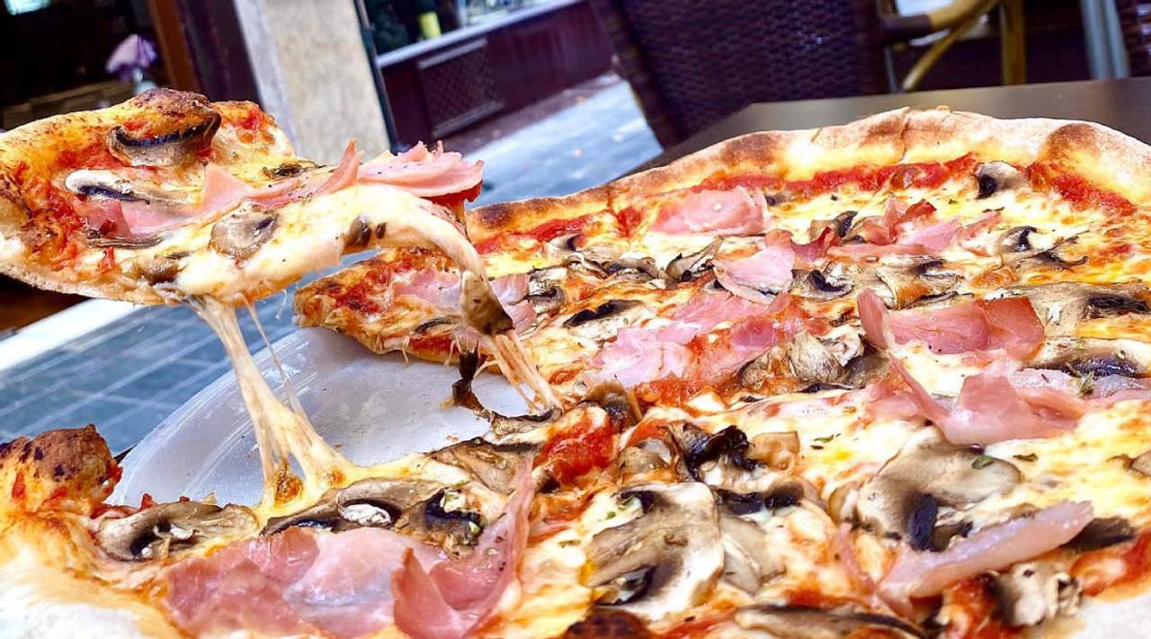 Tomate, mozzarella, champiñones, jamón York, alcachofas y aceitunas negras