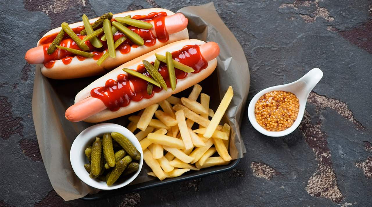 Patatas, salchicha, salsas kétchup, mayonesa y mostaza