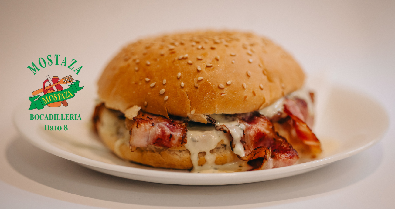 En pan de sésamo con salsa de roquefort y bacon.