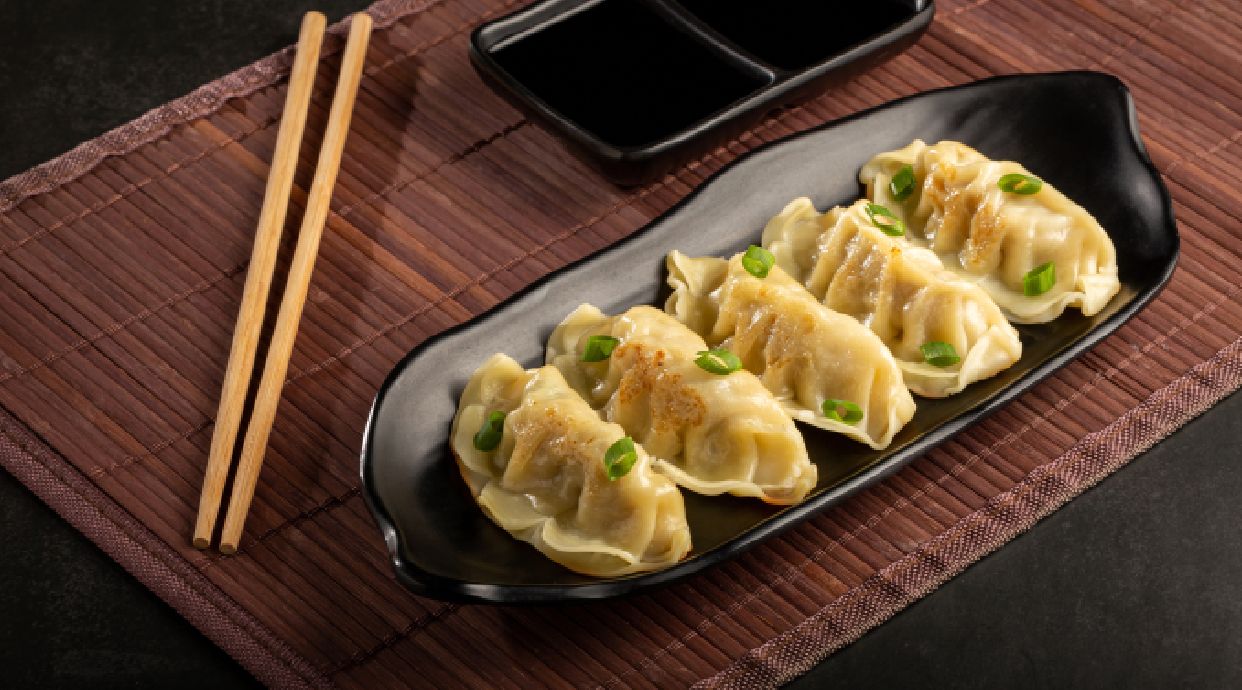 8 unidades de gyozas. Selección de 4 unidades en dos sabores, gyozas de langostinos y gyozas de verduras, acompañadas de una deliciosa salsa con base de soja.